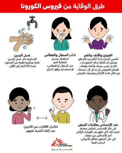 للمساعدة في منع انتشار مرض كوفيد-19:اغسِل يديك باستمرار. واستخدِم الماء والصابون أو محلولاً كحولياً لتعقيم اليدين.ابتعِد مسافةً آمنة عن أي شخص يسعل أو يعطس.ضَع كمامة عندما لا يكون التباعد الجسدي ممكناً.لا تلمس عينيك أو أنفك أو فمك.احرص على تغطية أنفك وفمك بكوعك أو بمنديل ورقي عند السعال أو العطس.ابقَ في المنزل إذا شعرت بالمرض.اطلب الرعاية الطبية إذا كنت مصاباً بالحمى والسعال وصعوبة التنفس.
